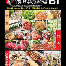 1.本日の前菜 2.冷しゃぶサラダ 3.漁港直送!豪快刺身三点盛り 4.肉巻き串盛り 5.海鮮チヂミ 6.地鶏のもも黒胡椒焼き 7.地鶏塩ちゃんこ鍋OR国産もつ鍋OR国産明太もつ鍋 8.雑炊ORうどん 9.野沢菜漬物と酢の物 10.本日のデザート